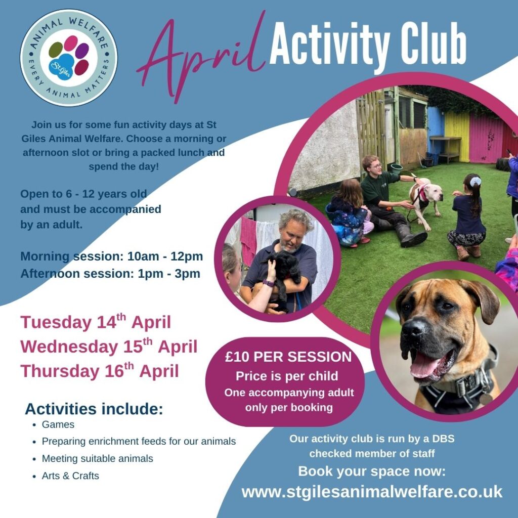 Join us for some fun activity days at St Giles Animal Welfare. Choose a morning or afternoon slot or bring a packed lunch and spend the day!